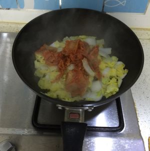 倒入辣白菜和辅料,东北这随处都可以买到朝鲜族大妈自家腌制的辣白菜,口感偏酸甜,因为里面有水果和番茄,所以本人又加着辣酱,放乳酪是跟顶级厨师学的,辣被乳酪中和后另又一种风味