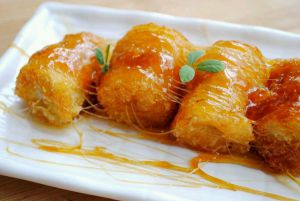 盛盘后,可以再将锅底剩余的糖浆,用勺子淋在香蕉表面上。