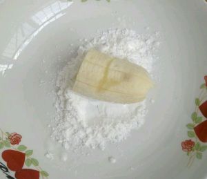 将香蕉剥去皮,切成滚刀块,放在面粉上滚蘸一层。