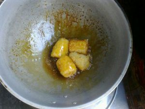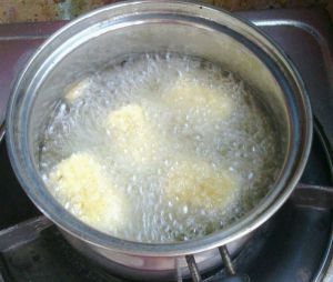 锅里放油,烧到七八成热,把香蕉块裹面糊,放到油锅里一反一正,炸到金黄,捞出来待用。