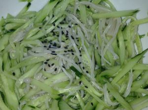 把所有准备好的菜放在小盆里拌匀,切好蒜放上边,依次倒入适量醋、酱油、盐、香油,锅里加少量油烧热,放入花生米炒熟,然后在炒花生米的油里放入干辣椒、花椒粒,大料炝出香味。然后扔掉,关火下入适量芝麻炝一下。油趁热的时候倒入菜上面。把之前炒熟的花生米用擀面杖碾碎倒入拌匀即可。
