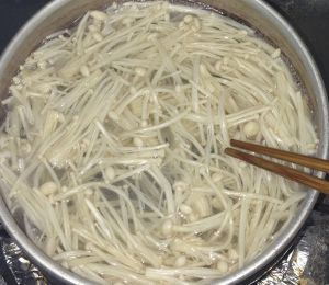 买来的金针菇尾部切除,洗干净,放入锅中,稍微煮2-4分钟!