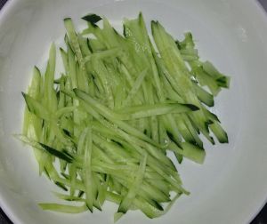 锅里烧开水,下入金针菇用水焯一下。焯完过一下凉水。焯金针菇的开水留下放入木耳进行泡发(节约用水),泡发后在清洗即可。胡萝卜削皮洗净檫丝。(以上步骤忘记拍片)