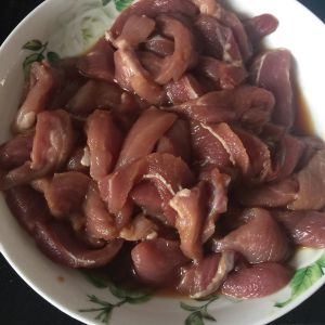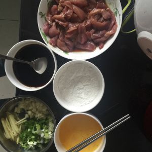 里脊肉切细条,放料酒、酱油、少许盐,腌制十五分钟!