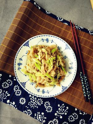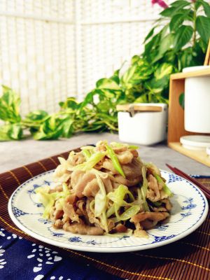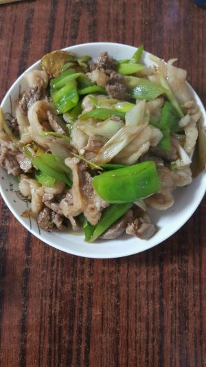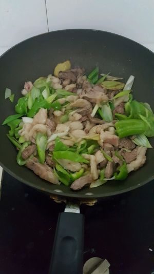 锅中加油,下肉爆炒后盛出 锅洗净加油,炒大葱,加入半勺老抽,翻炒出香味,加肉炒匀即可