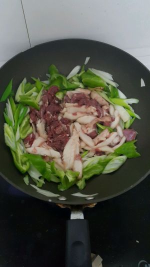 分别放入酱油、料酒、白胡椒、翻炒片刻。出锅前放入耗油、盐少许翻炒,少量水淀粉勾芡。