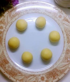面团包上豆沙馅揉成差不多大小的小丸子。