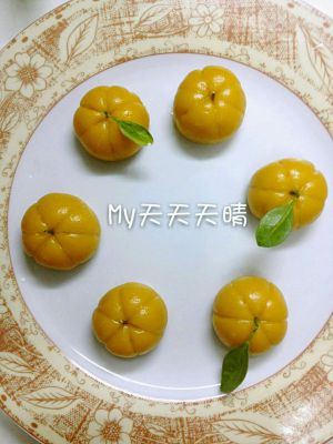 用牙签压出米字印痕。(叶子装饰最好蒸好后装饰,不然会变黄。)