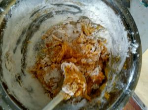 把南瓜泥,糯米粉,绵白糖均匀拌匀。
