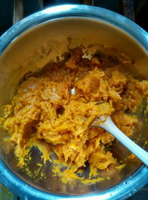 在南瓜泥中加入适量白砂糖(可按个人好口味)搅拌均匀