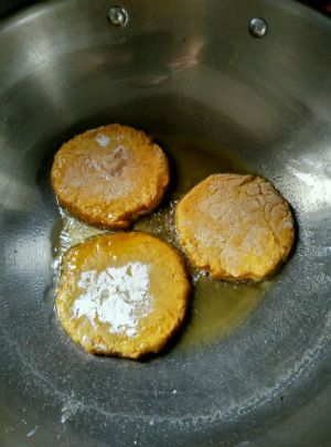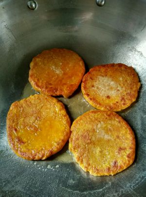 用低温油下锅炸,下锅时,南瓜轻轻压成饼。