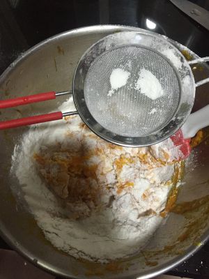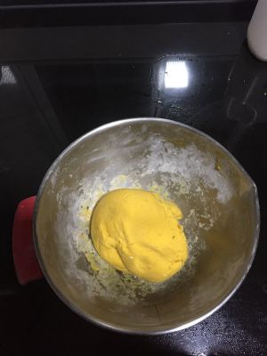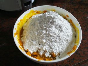 南瓜蒸熟后倒在糯米粉里,加白糖和一点清水和成面团。