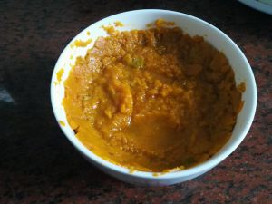在炒红豆沙的过程中将南瓜块蒸熟,趁热碾碎成南瓜泥。