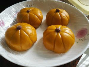 用塑料板或者牙签划出南瓜的纹路,用红豆沙做蒂。