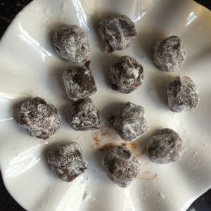 取适量豆沙团成圆球,共12份,我买的豆沙有点湿,粘了糯米粉团的
