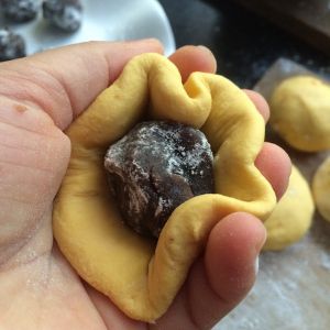 拿一个南瓜面球用手压成扁平的饼,放入一个豆沙球收口,团圆了备用