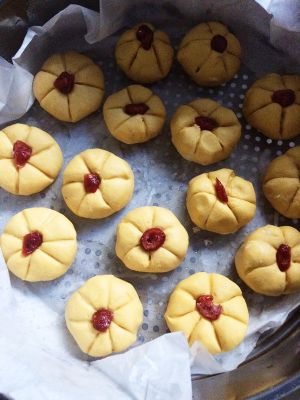 面团有多,我就按南瓜的形状把剩下的也做了,不过豆沙没了,南瓜面团又没有加糖,怕太没味道,就放了蜜渍柚子皮包进去,顶上还放了蔓越梅干装饰,蒸的时候就闻到了柚子清新的香味,不错!