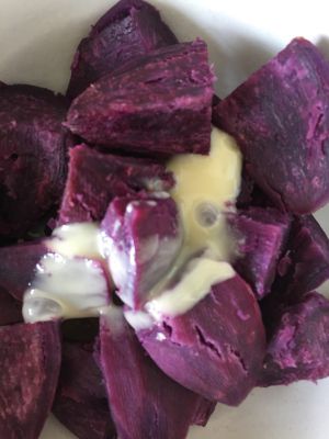 紫薯南瓜压成泥状拌入炼乳和糖粉