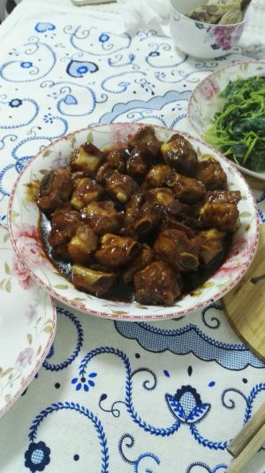 少量油,放入葱姜爆香,10颗冰糖,熬糖色,放入排骨,两汤勺生抽,三勺陈醋,如果有话梅可放五六粒味道会更佳。我家没有话梅了