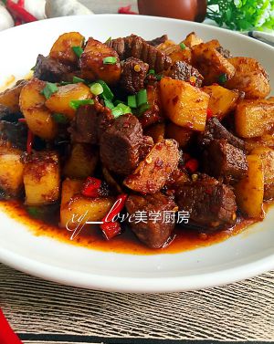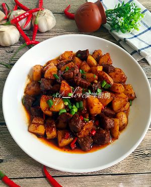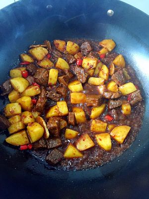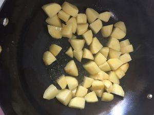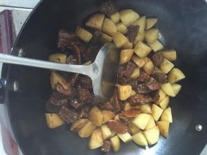 锅洗干净,重新倒油,爆炒土豆。我觉得重新倒油炒土豆,这样土豆表皮会起焦皮,我觉得更好吃!如果直接倒入牛肉里面里面一起炖煮,反而没有那个滋味了