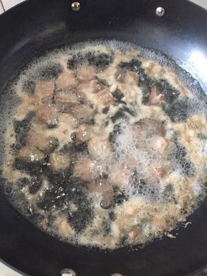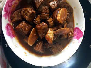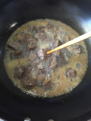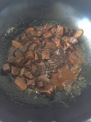 锅中放入适量油烧热,放入冰糖用铲子翻炒,此时将火力调成中小火,冰糖溶化开始出现金黄色时,将火力调到最小并不停搅拌糖浆,直到冰糖完全溶化,锅中出现棕红色糖浆时,放入牛肉,再放入少许老抽,不停翻炒,直到上色均匀。