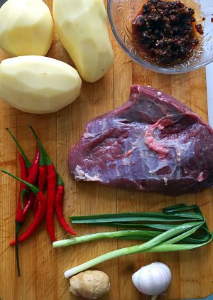 把新鲜的牛肉牛筋切成坨放进开水里焯出血水盛出备用,土豆去皮切块泡水里,干辣椒泡在温水里片刻捞出搽干净剪成段备用,葱姜蒜切成粒