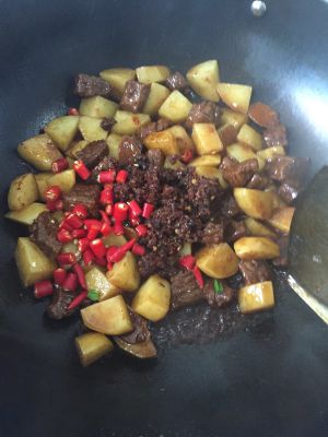 加入小米椒。牛肉酱。我自制牛肉酱里面有花椒,所以就不用放花椒了。如果家里没牛肉酱,可以放老干妈,或则豆瓣酱都可以,一定放花椒。牛肉跟花椒是绝配!