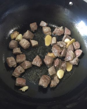 锅里油烧热。牛肉生姜大蒜下锅爆炒出香