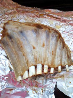 烤的时候我把边上一条很厚的肉和脆骨剪掉了,做别的菜吃。不然肉质厚薄不同,不容易烤得均匀