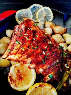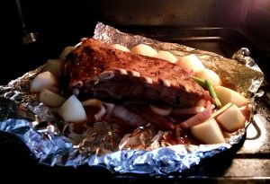 铺入锡纸 包住四周 进烤箱220度 一小时 中间可以半小时把包裹的锡纸敞开 有利于收汁