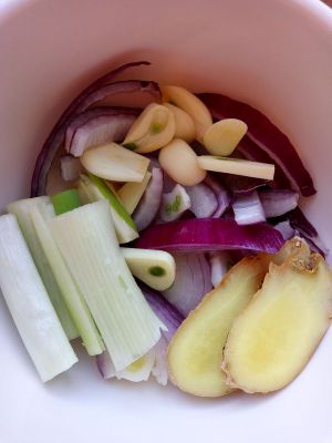 葱切段,姜蒜切片,洋葱切丝,土豆切块备用。 准备腌制的酱汁:将料酒、生抽、盐、红糖、蜂蜜、醋、胡椒粉调匀