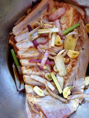 加入料酒,黄豆酱,老姜,花椒粉,辣椒粉,五香粉,大葱段,白糖,盐,生抽码味腌制1个小时