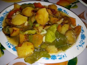 锅底留油,放入蒜片,酱油爆香。青椒胡萝卜先炒,再把土豆茄子倒入翻炒,加盐,最后水淀粉勾芡。