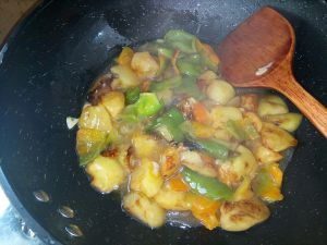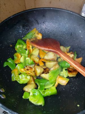 青椒茄子差不多就放土豆,然后放淀粉水勾芡一下,焖一会再放葱蒜即可。