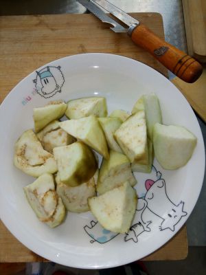 茄子去皮后斜着切,同样沥干水分,如果时间紧向上一个步骤一样处理。