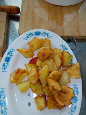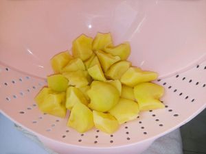 土豆用刀掰成大小差不多的块,然后用水洗好晾干。如果时间紧就在加热的锅里来回翻炒到没有水分。记住不要放油,干炒主要是为了沥水。