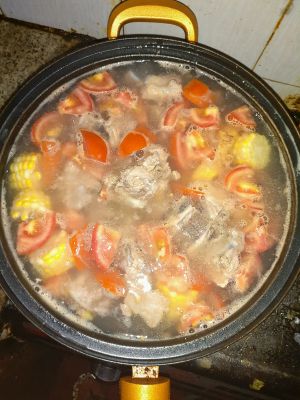 汤锅中的排骨汤煮成乳白色,将胡萝卜,玉米,番茄一起加入排骨汤中,用小火熬40分钟,把胡萝卜和排骨熬烂,加入少许鸡精和胡椒即可!