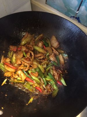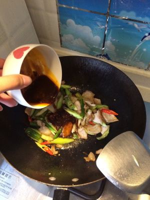 然后放豆瓣酱、生抽拌匀翻炒,最后将青椒和葱段放入,加一点盐,不停翻炒几分钟即可。