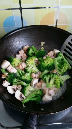 热锅,倒油,七分热时倒入虾仁,翻炒数下,待虾仁都卷成一个个虾球时,倒入西兰花和蘑菇。