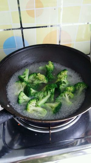 西兰花切小朵,清水洗净后,放入开水中焯烫十秒钟,然后捞出放入凉水中待用。