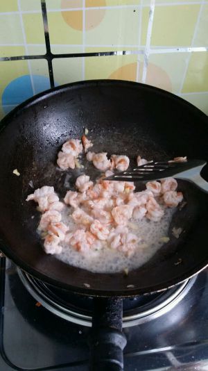 锅入油,油热后加入腌好的虾翻炒,虾变白后盛出。