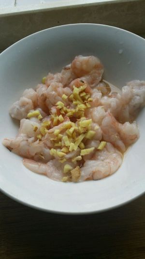 新鲜的海虾去壳,用小刀切开虾背抽筋,放入姜末和料酒腌制十分钟。