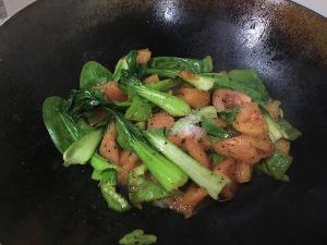 加入青菜,加入一点盐翻炒