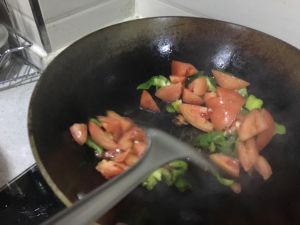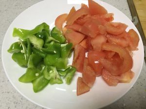 按照顺序,加入青椒、番茄翻炒