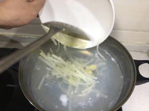刚才煮过虾球的汤加入萝卜煮沸就是好喝解腻清汤,刚才使用蛋清剩下的蛋黄也可以煮进去哦