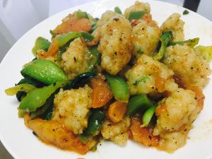 上浆:将鸡蛋清和盐混合,并适度搅拌使鸡蛋清不再有块状,然后把虾用纸将表面水分吸干,并与蛋清混合拌匀至有点粘状,加入适量淀粉再进行搅拌,直至不见淀粉颗粒;