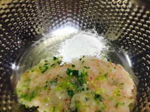 处理过的虾放入碗中,加少许料酒、盐、淀粉用手抓匀,放置数分钟。