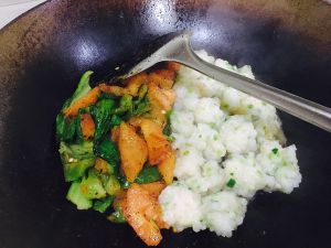 加入虾球,先在锅底稍稍蒸发水汽,过一分钟再翻炒,出锅