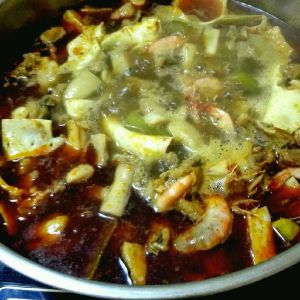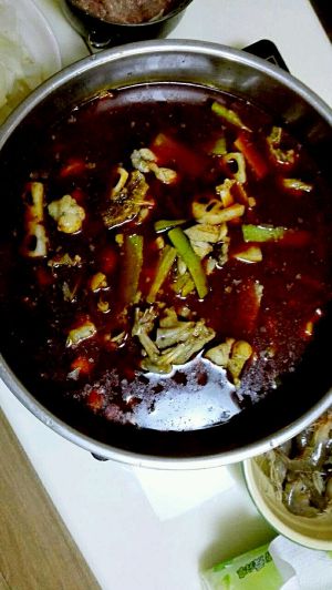 把碗内佐料倒入热油锅内炒出红油,然后加水烧开。