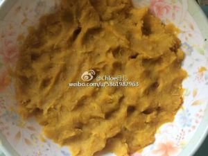 南瓜切成薄片在微波炉里10分钟,拿出来后去皮,用筷子搅拌成泥